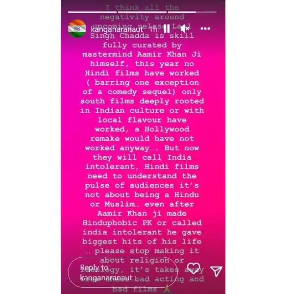कंगना रनौत ने अपने पोस्ट में आमिर खान के भारत में फैली असहिष्णुता वाले बयान पर भी तंज कसते हुए कहा, “लेकिन अब वो भारत को असहिष्णु कहेंगे। हिंदी फिल्ममेकर्स को दर्शकों की नब्ज को समझने की जरूरत है। यह हिंदू या मुसलमान होने के बारे में नहीं है। आमिर खान (Aamir Khan) जी ने हिंदूफोबिक पीके बनाई और भारत को असहिष्णु देश बताया बावजूद इसके उन्होंने अपने जीवन की सबसे बड़ी हिट फिल्में दीं। कृप्या इसे रिलीजन और विचारधारा से जोड़ना बंद कर दें। यह उनकी खराब एक्टिंग और खराब फिल्मों से अलग है।”