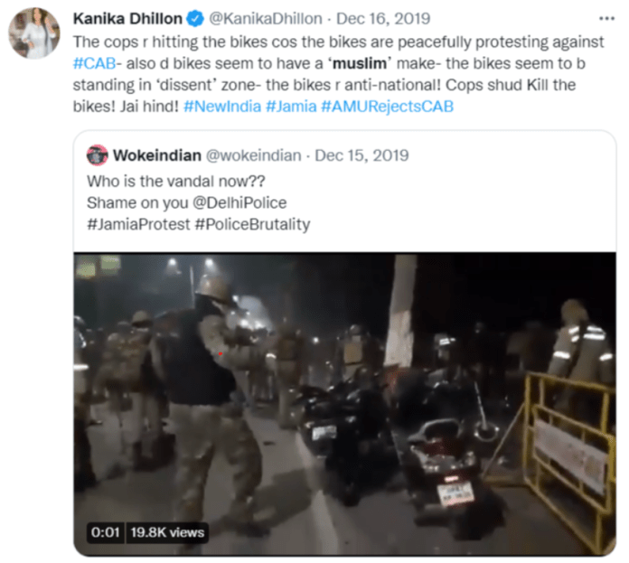 इसके बाद जब साल 2019 में नागरिक संशोशन अधिनियम के विरुद्ध प्रदर्शन शुरू हुए तो कनिका ढिल्लों सक्रिय रूप से प्रदर्शनकारियों के समर्थन में ट्वीट करती दिखीं थी। उन्होंने अपने ट्वीट में पुलिस को इस तरह पेश किया था कि प्रदर्शन के दौरान सिर्फ मुस्लिमों पर हमला नहीं किया बल्कि साथ में उनके वाहनों में भी तोड़फोड़ की थी।