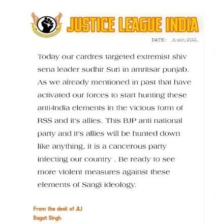 अमृतसर में मूर्तियों के साथ हुई बेअदबी के विरोध में मंदिर के बाहर धरना दे रहे शिवसेना नेता सुधीर सूरी की हमलावरों ने सरेआम गोली मारकर हत्या कर दी गई। इस घटना को अंजाम देने वाले एक आरोपी को लाइसेंसी हथियार के साथ दबोच लिया गया। पुलिस इस घटना में कई एंगल से जांच कर रही है।