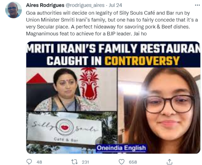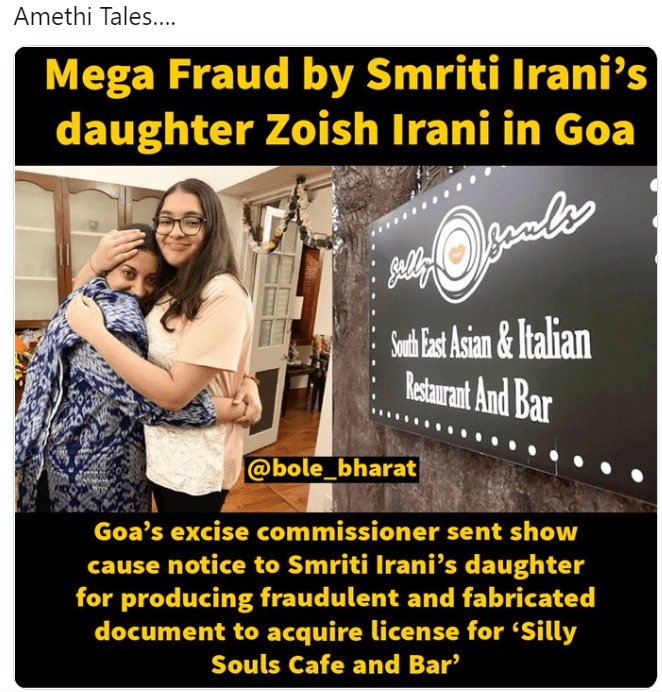 रही बात कैफे की, तो मौजूद जानकारी यही कहती है कि ये कैफे वैध है। जुबिन ईरानी ने इसे अपने साथी एंथनी डगामा के साथ मिल शुरू किया था। लेकिन डगामा का देहांत 2021 में हो गया। अब उसका स्वामित्व उनके बेटे के पास है और शराब का लाइसेंस पाने के लिए जिन ‘फर्जी दस्तावेजों’ को पेश करनी की बात हुई, वो भी उन्हीं से जुड़े हैं।