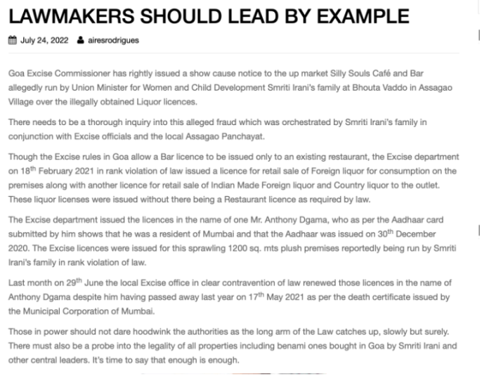 जोइश ईरानी पर कॉन्ग्रेस के हमलों का कनेक्शन द वायर से भी है। 21 जुलाई को द वायर ने ही कुणाल विजयकर नाम के यूट्यूबर की वीडियो को आधार बनाकर दिखाया था कि कैसे जोइश का कनेक्शन बार से है और वो कह रही हैं कि काश ‘सिली सोल्स’ गोवा का फूड डेस्टिनेशन बन जाए।