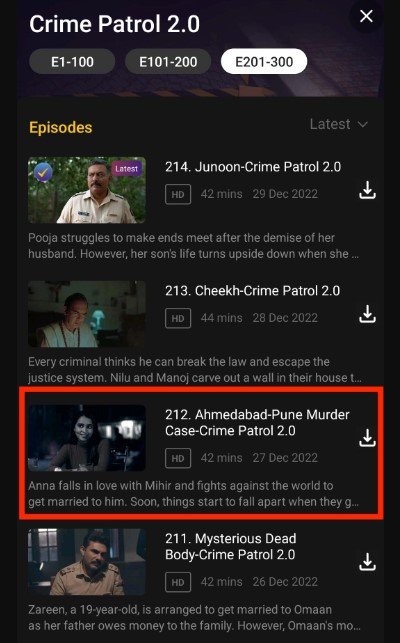 SONY LIV पर इस एपिसोड की संख्या 212 है और क्राइम पेट्रोल 2.0 के तहत इसे ‘अहमदाबाद-पुणे’ हत्या का नाम दिया गया है। Sony LIV ऐप के इस स्क्रीनशॉट में आप लाल रंग से चिह्नित उक्त एपिसोड को देख सकते हैं।