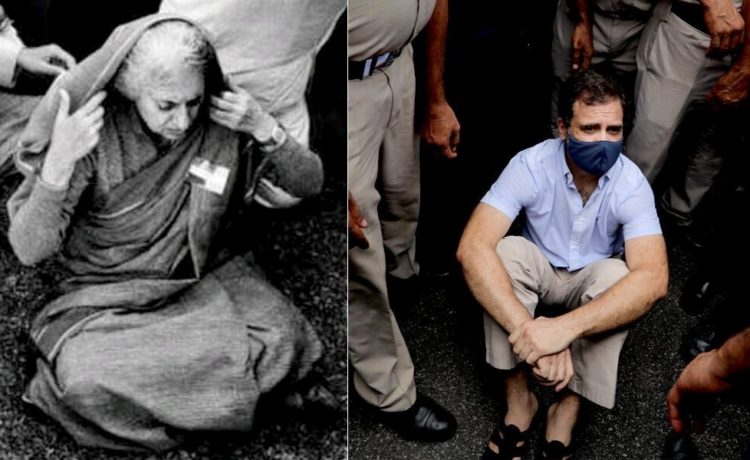 कांग्रेस पार्टी ने धरने के दौरान राहुल गांधी के अपनी दादी इंदिरा गांधी की तरह तेवर दिखाने पर इंदिरा गांधी की धरना देते हुए एक तस्वीर शेयर की और लिखा कि इतिहास दोहरा रहा है। ये तस्वीर सोशल मीडिया पर काफी वायरल हो रही है। फोटो में राहुल गांधी अपनी दादी और पूर्व प्रधानमंत्री स्वर्गीय दिवंगत के साथ नजर आ रहे हैं