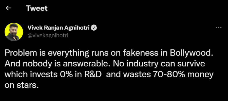 विवेक ने ट्वीट करते हुए लिखा ‘दिक्कत यह है कि बॉलीवुड में सब कुछ झूठ के आधार पर चलता है। और इसका कोई जवाबदेह नहीं है। ऐसे में कोई भी इंडस्ट्री लंबा नहीं चल सकती जो आर एंड डी में 0 प्रतिशत इन्वेस्ट करती है और सितारों पर 70 से 80 प्रतिशत पैसा बहाती है।’ इससे पहले भी विवेक अग्निहोत्री ब्रह्मास्त्र पर बात करते हुए इस फिल्म के डायरेक्टर्स और सितारों को खरी खोटी सुना चुके हैं। ब्रह्मास्त्र पार्ट वन शिवा अयान मुखर्जी की मॉडर्न मिथिलाॅजी ड्रामा का पहला पार्ट है। इस फिल्म में रणबीर कपूर और आलिया भट्ट के साथ अमिताभ बच्चन, मौनी रॉय और नागार्जुन मुख्य भूमिका में नजर आए। खबरों के अनुसार, तकरीबन 400 करोड़ रुपए की लागत में इस फिल्म का निर्माण किया गया है।