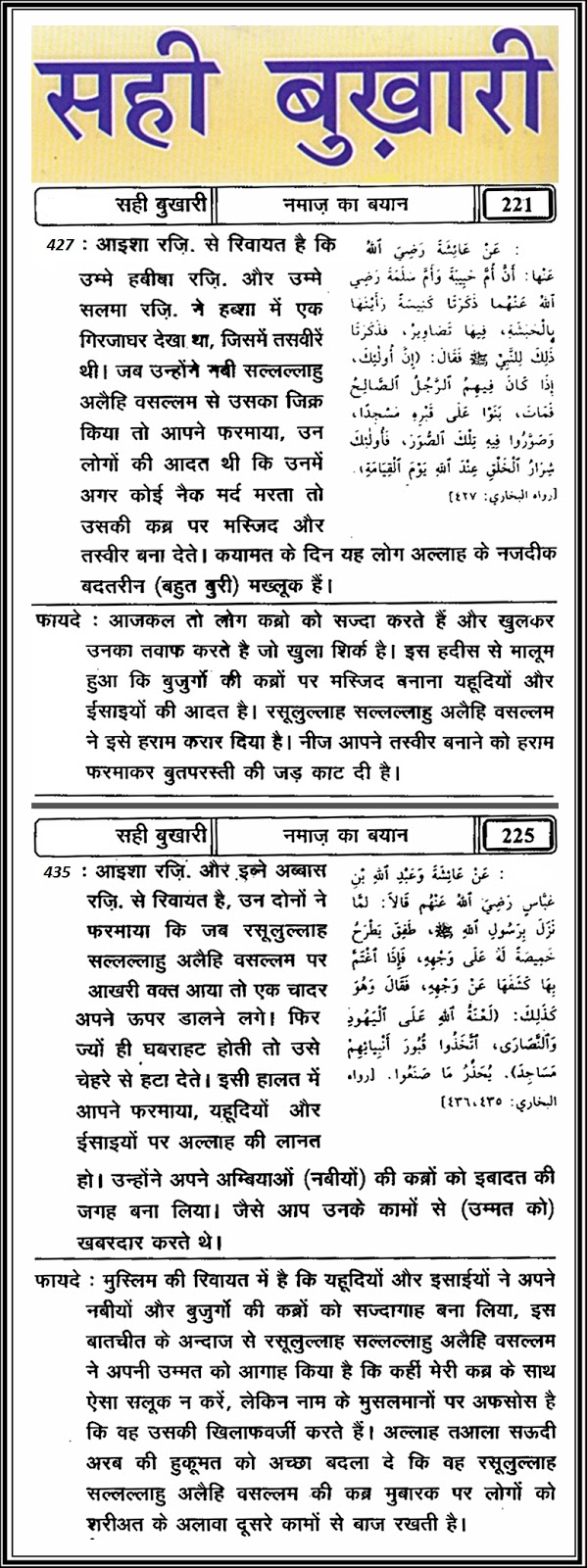 “ऐे मेरी उम्मत के लोगों, खबरदार हो जाओ के तुमसे पहले जो लोग गुज़रे हैं उन्होंने अपने औलिया और अम्बिया की कब्रों को अपना इबादतगाह बन लेते थे, खबरदार..तुम कबरों को इबादतगाह मत बनाना, मैं तुम्हे ऐसा करने से मना करता हूँ”