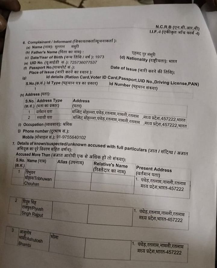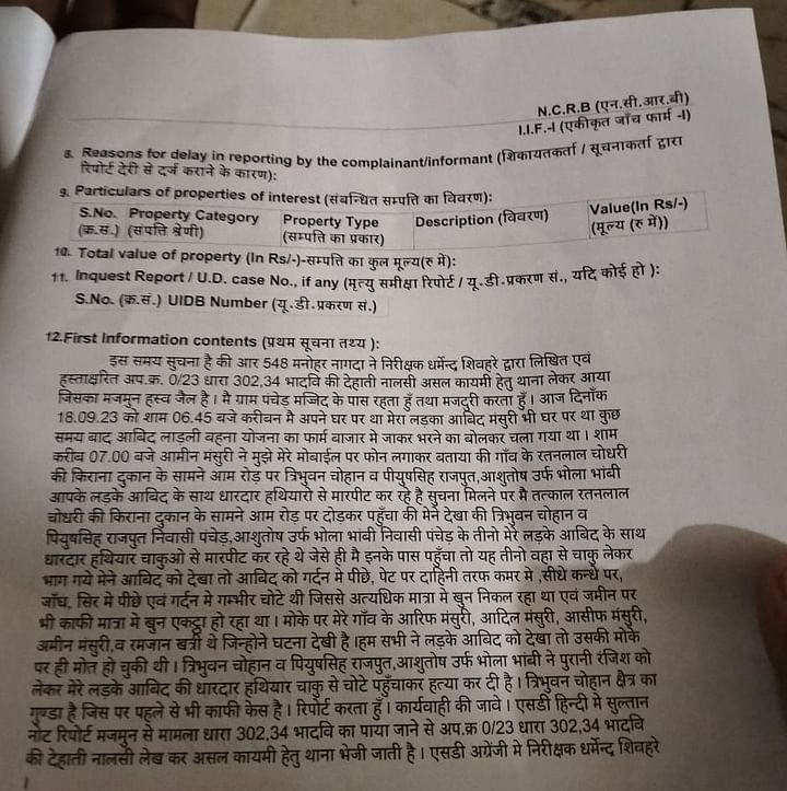 FIR के अनुसार, मृतक की पिता ने बताया कि उनका बेटा आबिद मंसूरी लाड़ली योजना का फॉर्म भरने बाजार गया था. शाम करीब 7 बजे आमीन मंसूरी ने मुझे फोन कर बताया कि गांव के रतनलाल चौधरी की किराना दुकान के सामने त्रिभुवन चौहान, पीयूष सिंह राजपूत, आशुतोष उर्फ भोला भाबी धारदार हथियार से लैस हैं और आबिद के साथ मारपीट कर रहे हैं.