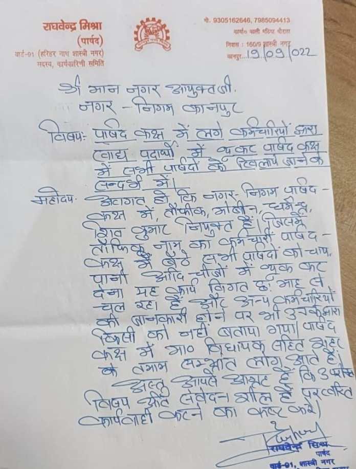 कानपुर के वार्ड संख्या 91 के पार्षद राघवेंद्र मिश्रा द्वारा नगर आयुक्त को इस बाबत शिकायती पत्र प्रेषित किया गया। इस पत्र में उन्होंने लिखा था कि नगर निगम पार्षदों के कमरे में तौफीक, मुबीन, धर्मेंद्र कुमार और शिव कुमार नाम के कर्मचारियों की नियुक्ति है।