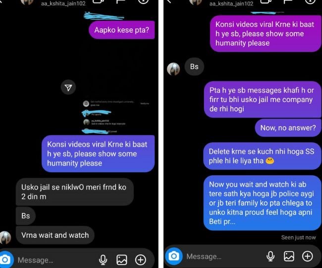 बताया जा रहा है कि इस मामले में छात्राओं को अलग-अलग नंबरों से धमकी भरे मैसेज आ रहे हैं। मैसेज भेजने वाली युवती की चैट भी सामने आई है। इसमें लिखा है, “उसको जेल से निकलवाओ मेरी फ्रेंड को दो दिन में, वरना वेट एंड वॉच। तुम्हारा वीडियो भी है मेरे पास है।” इस पर छात्रा ने कहा कि कौन-सी वीडियो वायरल करने की बात कर रही है। छात्रा ने जवाब में कहा कि वह पुलिस को इसकी शिकायत देगी और उसे भी उसकी सहेली के साथ जेल में रहना पड़ेगा। इसके बाद युवती ने अपनी चैट डिलीट कर ली, लेकिन छात्रा ने उस चैट का स्क्रीनशॉट ले लिया था।