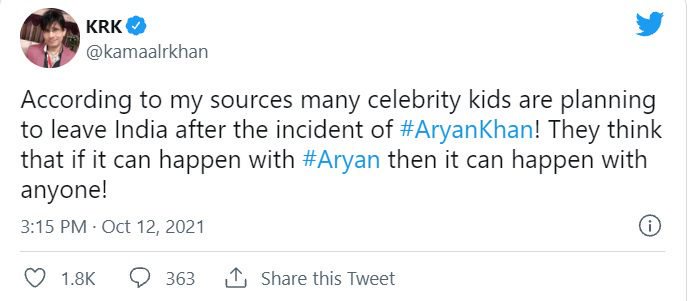 सोशल मीडिया पर कमाल खान का एक पोस्ट तेजी से वायरल हो रहा है। इस पोस्ट में कमाल खान ने बताया है कि कई स्टार किड्स अब देश छोड़ने की प्लानिंग कर रहे हैं क्योंकि उन्हें अब यहां डर लग रहा है। केआरके ने अपने पोस्ट में लिखा, मेरे सूत्रों के मुताबिक आर्यन खान की घटना के बाद कई सेलिब्रिटी किड्स इंडिया छोड़ने की प्लानिंग कर रहे हैं। कमाल खान ने आगे लिखा, कि अगर आर्यन के साथ ऐसा हो सकता है तो किसी के साथ भी हो सकता है।