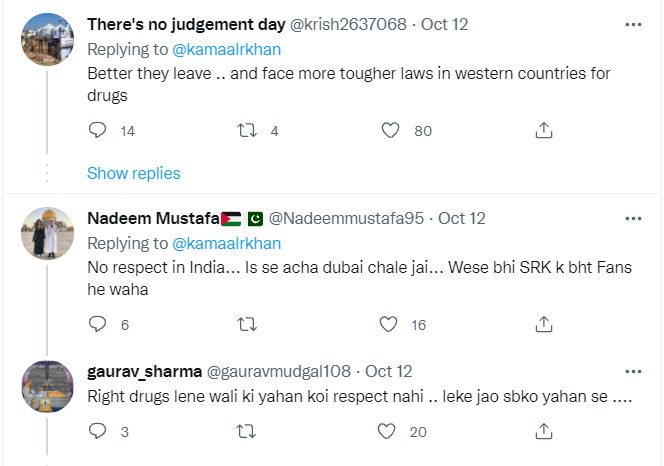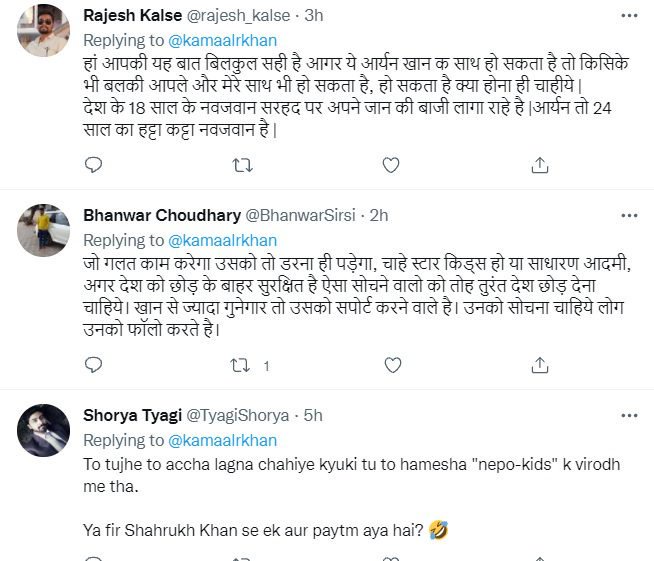 एक यूजर ने लिखा, ”जो गलत काम करेगा उसको तो डरना ही पड़ेगा, चाहे स्टार किड्स हो या साधारण आदमी, अगर देश को छोड़ के बाहर सुरक्षित है ऐसा सोचने वालो को तोह तुरंत देश छोड़ देना चाहिये। खान से ज्यादा गुनेगार तो उसको सपोर्ट करने वाले है। उनको सोचना चाहिये लोग उनको फॉलो करते हैं।”