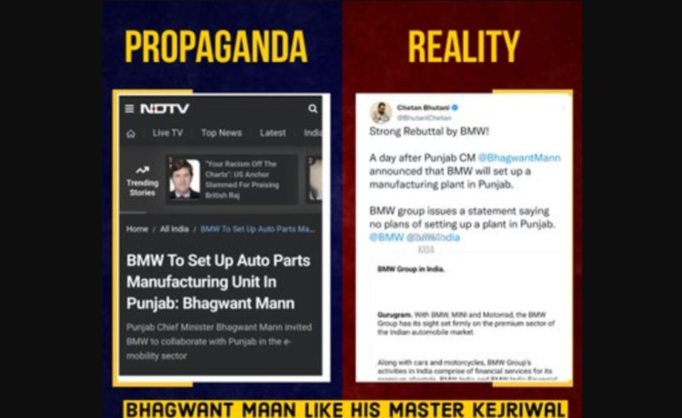 पंजाब में आम आदमी पार्टी की भगवंत मान सरकार की इंटरनेशनल बेइज्जती हो रही है। कुछ देर पहले पंजाब के मुख्यमंत्री भगवंत मान ने दावा किया कि जर्मनी की दिग्गज कार निर्माता कंपनी बीएमडब्ल्यू पंजाब में ऑटो पार्ट्स बनाने वाली एक यूनिट लगाने के लिए तैयार हो गई है। मुख्यमंत्री मान ने मंगरवार को म्यूनिख दौरे के दौरान बताया कि कंपनी ने राज्य में ऑटो पार्ट्स बनाने वाली इकाई लगाने पर सहमति जताई है। सीएम भगवंत मान ने कहा कि इससे राज्य के युवाओं के लिए रोजगार के नए मौके उपलब्ध होंगे। मान के घोषणा करते ही यह खबर फैल गई। हर चैनल, अखबार में इसी की खबर चल रही थी। इसी के बारे में चर्चा हो रही थी और आम आदमी पार्टी के नेता अपनी पीठ थपथपा रहे थे।