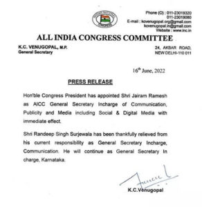 बहरहाल, वेणुगोपाल के हस्ताक्षर वाले इस पत्र में कहा गया है, ‘आदरणीय कांग्रेस अध्यक्ष ने जयराम रमेश को तुरंत प्रभाव से कम्यूनिकेशन, पब्लिसिटी और मीडिया (सोशल और डिजिटल मीडिया समेत) का प्रभारी महासचिव बनाया है।’ इस पत्र की दूसरी पंक्ति में कहा गया है कि अध्यक्ष ने रणदीप सुरजेवाला को कम्यूनिकेशन के प्रभारी महासचिव की जिम्मेदारी से मुक्त कर दिया है। वो कर्नाटक के प्रभारी महासचिव बने रहेंगे। उदयपुर चिंतन शिविर के नवसंकल्प के आधार पर कांग्रेस अपने संचार एवं मीडिया विभाग का कायाकल्प कर रही है। अब सोशल एवं डिजिटल मीडिया विभाग भी संचार एवं मीडिया विभाग के तहत आएगा।